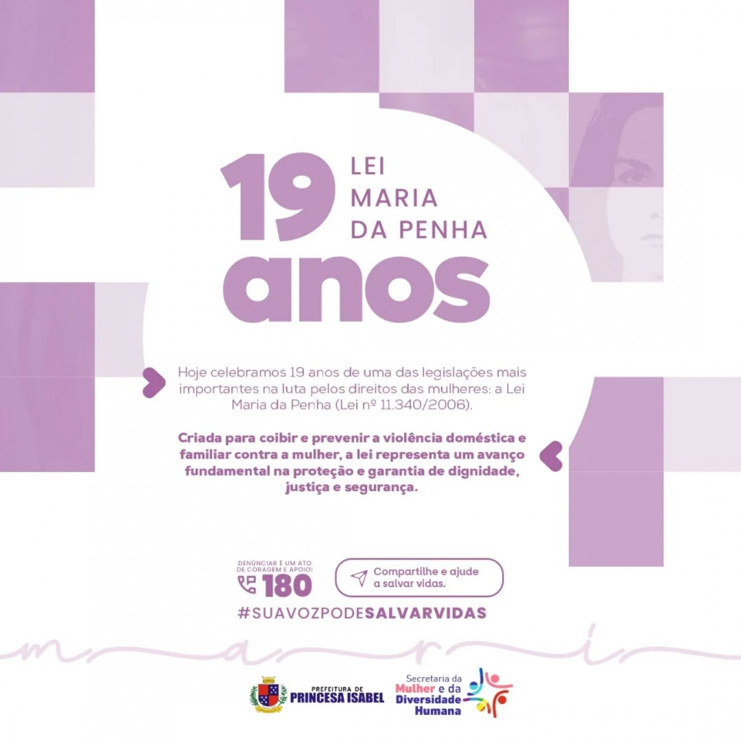 Hoje celebramos uma das legislações mais importantes na luta pelos direitos das mulheres. A Lei Maria da Penha (Lei nº 11.340/2006) foi criada para combater e prevenir a violência doméstica e familiar contra a mulher.