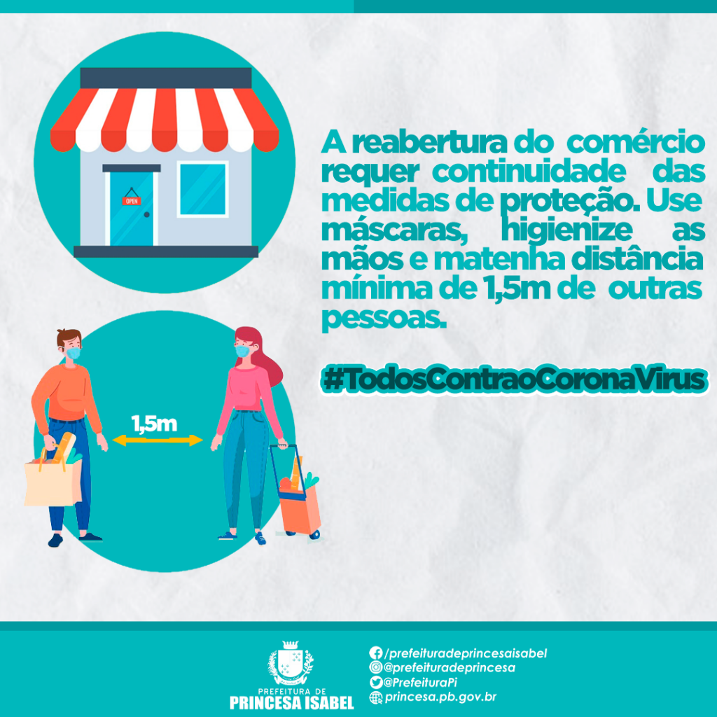 A reabertura do comércio requer muito cuidado. É preciso manter o uso de máscaras, higienização das mãos (água e sabão ou álcool em gel) e distanciamento de outras pessoas. Estas são as principais medidas de combate à disseminação do Corona vírus. Portanto, faça sua parte. Se precisar sair de casa, não esqueça a máscara; se puder, fique em casa!