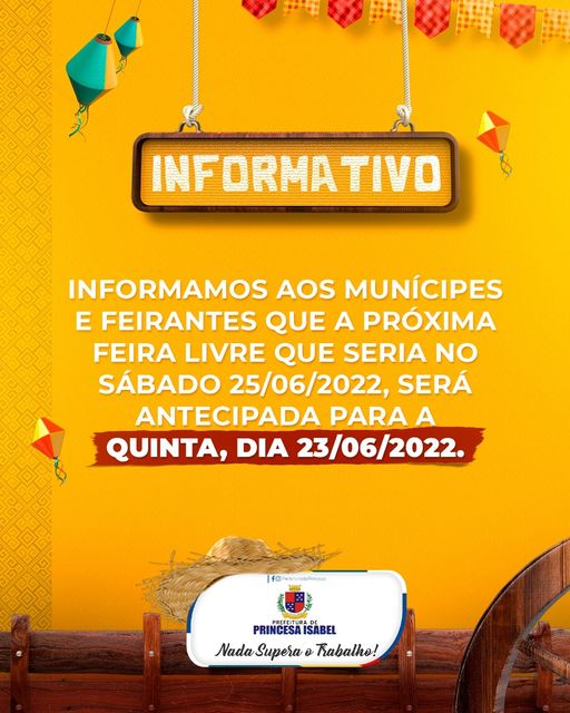 Atenção, Princesa Isabel! Na próxima semana, a feira livre será realizada na quinta-feira (23).