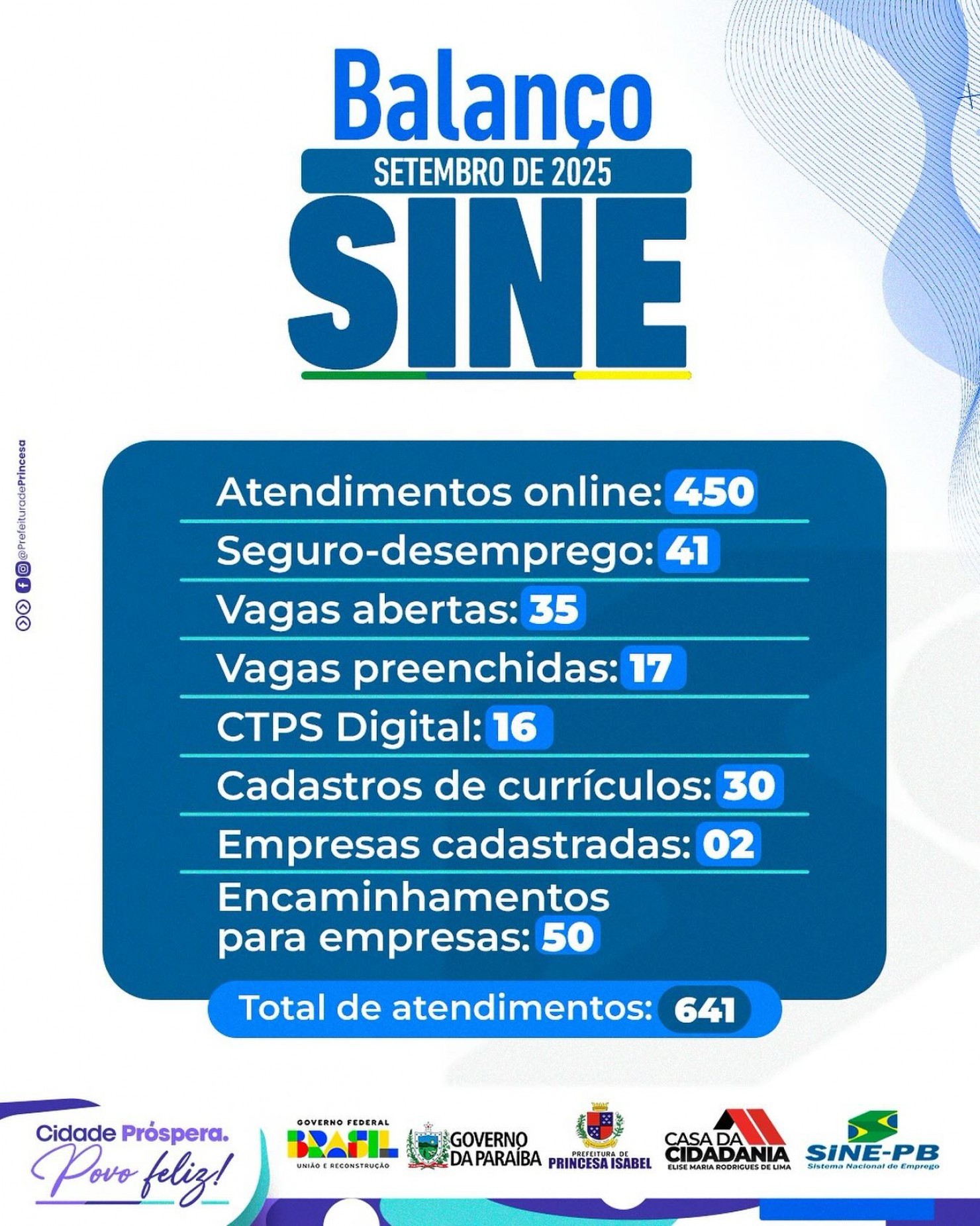 O Sistema Nacional de Emprego (SINE) segue contribuindo com a geração de oportunidades e o fortalecimento do mercado de trabalho local. Ao longo do mês de setembro, diversos serviços foram ofertados à população, como emissão de carteira de trabalho digital, cadastro de currículos, intermediação de mão de obra e orientação para o trabalhador.