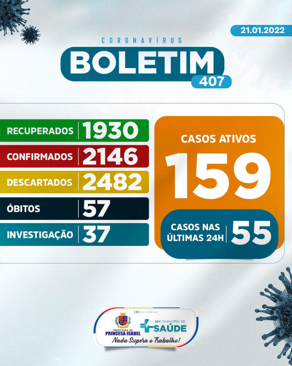 1. Até o momento foram atendidos no Hospital Regional Deputado José Pereira Lima, UPA 24h e na Rede de Atenção Básica 4.665 pessoas suspeitas de infecção por COVID-19 (Coronavírus); desses, 2.482 foram descartados, 2.146 confirmados e 37 casos estão em investigação. Dos confirmados, 1.930 foram recuperados e 57 foram a óbito.