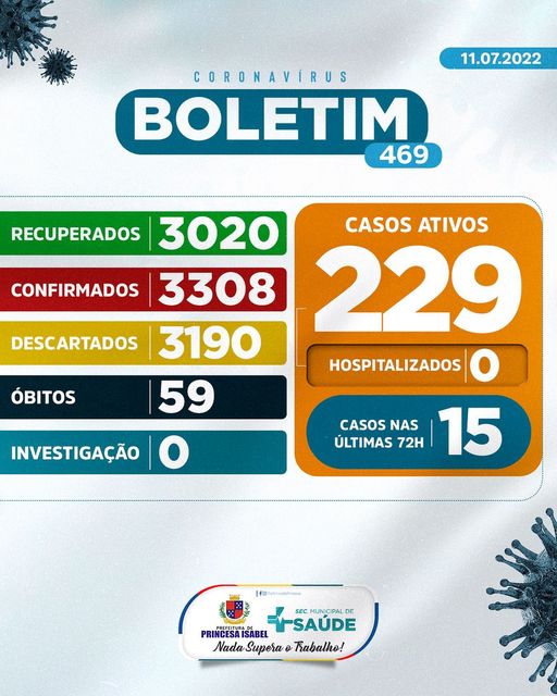 O Comitê Gestor da Crise COVID-19, em Princesa Isabel, informa: 1. Até o momento foram atendidos no Hospital Regional Deputado José Pereira Lima, UPA 24h e na Rede de Atenção Básica 6.498 pessoas suspeitas de infecção por COVID-19 (Coronavírus); desses, 3.190 foram descartados, 3.308 confirmados e nenhum caso está em investigação. Dos confirmados, nenhum está hospitalizado, 3.020 foram recuperados e 59 foram a óbito. 2. Todas as medidas utilizadas para atestar como casos suspeitos e casos descartados, seguem rigorosamente o que preconiza o Ministério da Saúde; 3. As determinações do Ministério da Saúde para achatar a curva epidemiológica da disseminação da COVID-19 e de suas variantes continuam massificadas; 4. As determinações contidas nos decretos municipais DEVEM ser cumpridas. Princesa Isabel, 11 de julho de 2022.