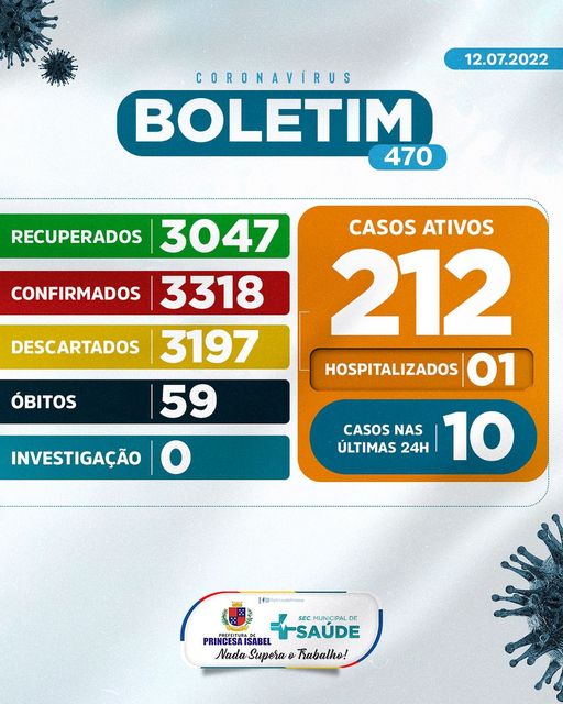 O Comitê Gestor da Crise COVID-19, em Princesa Isabel, informa: 1. Até o momento foram atendidos no Hospital Regional Deputado José Pereira Lima, UPA 24h e na Rede de Atenção Básica 6.515 pessoas suspeitas de infecção por COVID-19 (Coronavírus); desses, 3.197 foram descartados, 3.318 confirmados e nenhum caso está em investigação. Dos confirmados, 01 está hospitalizado, 3.047 foram recuperados e 59 foram a óbito. 2. Todas as medidas utilizadas para atestar como casos suspeitos e casos descartados, seguem rigorosamente o que preconiza o Ministério da Saúde; 3. As determinações do Ministério da Saúde para achatar a curva epidemiológica da disseminação da COVID-19 e de suas variantes continuam massificadas; 4. As determinações contidas nos decretos municipais DEVEM ser cumpridas. Princesa Isabel, 12 de julho de 2022.