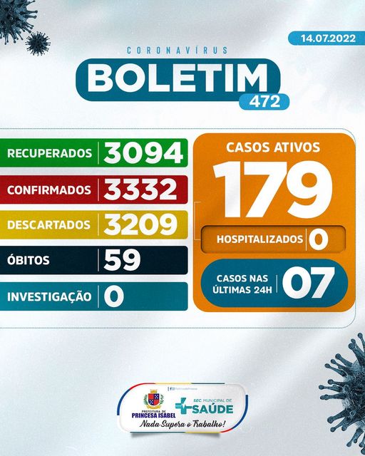 O Comitê Gestor da Crise COVID-19, em Princesa Isabel, informa: 1. Até o momento foram atendidos no Hospital Regional Deputado José Pereira Lima, UPA 24h e na Rede de Atenção Básica 6.541 pessoas suspeitas de infecção por COVID-19 (Coronavírus); desses, 3.209 foram descartados, 3.332 confirmados e nenhum caso está em investigação. Dos confirmados, nenhum está hospitalizado, 3.094 foram recuperados e 59 foram a óbito. 2. Todas as medidas utilizadas para atestar como casos suspeitos e casos descartados, seguem rigorosamente o que preconiza o Ministério da Saúde; 3. As determinações do Ministério da Saúde para achatar a curva epidemiológica da disseminação da COVID-19 e de suas variantes continuam massificadas; 4. As determinações contidas nos decretos municipais DEVEM ser cumpridas. Princesa Isabel, 14 de julho de 2022.