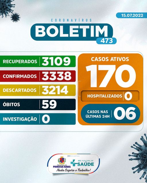 O Comitê Gestor da Crise COVID-19, em Princesa Isabel, informa: 1. Até o momento foram atendidos no Hospital Regional Deputado José Pereira Lima, UPA 24h e na Rede de Atenção Básica 6.552 pessoas suspeitas de infecção por COVID-19 (Coronavírus); desses, 3.214 foram descartados, 3.338 confirmados e nenhum caso está em investigação. Dos confirmados, nenhum está hospitalizado, 3.0109 foram recuperados e 59 foram a óbito. 2. Todas as medidas utilizadas para atestar como casos suspeitos e casos descartados, seguem rigorosamente o que preconiza o Ministério da Saúde; 3. As determinações do Ministério da Saúde para achatar a curva epidemiológica da disseminação da COVID-19 e de suas variantes continuam massificadas; 4. As determinações contidas nos decretos municipais DEVEM ser cumpridas. Princesa Isabel, 15 de julho de 2022.