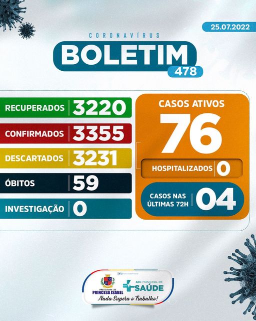 O Comitê Gestor da Crise COVID-19, em Princesa Isabel, informa: 1. Até o momento foram atendidos no Hospital Regional Deputado José Pereira Lima, UPA 24h e na Rede de Atenção Básica 6.586 pessoas suspeitas de infecção por COVID-19 (Coronavírus); desses, 3.231 foram descartados, 3.355 confirmados e nenhum caso está em investigação. Dos confirmados, nenhum está hospitalizado, 3.220 foram recuperados e 59 foram a óbito. 2. Todas as medidas utilizadas para atestar como casos suspeitos e casos descartados, seguem rigorosamente o que preconiza o Ministério da Saúde; 3. As determinações do Ministério da Saúde para achatar a curva epidemiológica da disseminação da COVID-19 e de suas variantes continuam massificadas; 4. As determinações contidas nos decretos municipais DEVEM ser cumpridas. Princesa Isabel, 25 de julho de 2022.