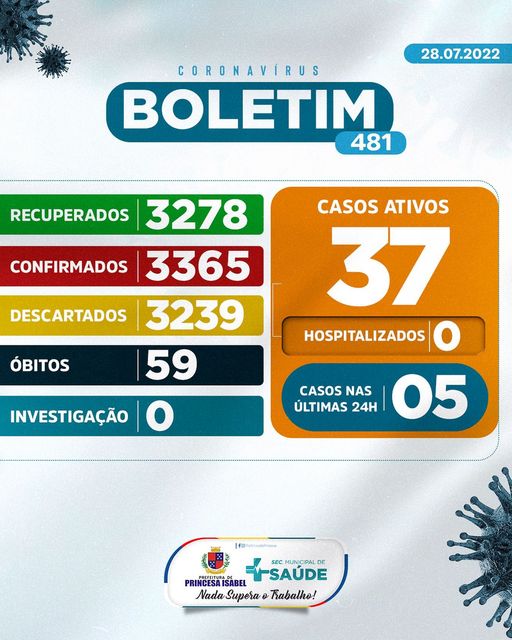 O Comitê Gestor da Crise COVID-19, em Princesa Isabel, informa: 1. Até o momento foram atendidos no Hospital Regional Deputado José Pereira Lima, UPA 24h e na Rede de Atenção Básica 6.604 pessoas suspeitas de infecção por COVID-19 (Coronavírus); desses, 3.239 foram descartados, 3.365 confirmados e nenhum caso está em investigação. Dos confirmados, nenhum está hospitalizado, 3.278 foram recuperados e 59 foram a óbito. 2. Todas as medidas utilizadas para atestar como casos suspeitos e casos descartados, seguem rigorosamente o que preconiza o Ministério da Saúde; 3. As determinações do Ministério da Saúde para achatar a curva epidemiológica da disseminação da COVID-19 e de suas variantes continuam massificadas; 4. As determinações contidas nos decretos municipais DEVEM ser cumpridas. Princesa Isabel, 28 de julho de 2022.