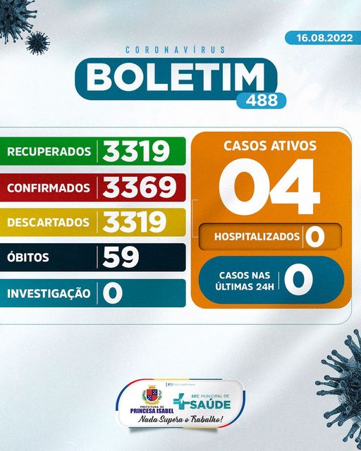 O Comitê Gestor da Crise COVID-19, em Princesa Isabel, informa: 1. Até o momento foram atendidos no Hospital Regional Deputado José Pereira Lima, UPA 24h e na Rede de Atenção Básica 6.688 pessoas suspeitas de infecção por COVID-19 (Coronavírus); desses, 3.319 foram descartados, 3.369 confirmados e nenhum caso está em investigação. Dos confirmados, nenhum está hospitalizado, 3.319 foram recuperados e 59 foram a óbito. 2. Todas as medidas utilizadas para atestar como casos suspeitos e casos descartados, seguem rigorosamente o que preconiza o Ministério da Saúde; 3. As determinações do Ministério da Saúde para achatar a curva epidemiológica da disseminação da COVID-19 e de suas variantes continuam massificadas; 4. As determinações contidas nos decretos municipais DEVEM ser cumpridas. Princesa Isabel, 16 de agosto de 2022.