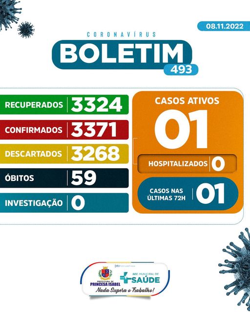 O Comitê Gestor da Crise COVID-19, em Princesa Isabel, informa: 1. Até o momento foram atendidos no Hospital Regional Deputado José Pereira Lima, UPA 24h e na Rede de Atenção Básica 6.639 pessoas suspeitas de infecção por COVID-19 (Coronavírus); desses, 3.268 foram descartados, 3.371 confirmados e nenhum caso está em investigação. Dos confirmados, nenhum está hospitalizado, 3.324 foram recuperados e 59 foram a óbito. 2. Todas as medidas utilizadas para atestar como casos suspeitos e casos descartados, seguem rigorosamente o que preconiza o Ministério da Saúde; 3. As determinações do Ministério da Saúde para achatar a curva epidemiológica da disseminação da COVID-19 e de suas variantes continuam massificadas; 4. As determinações contidas nos decretos municipais DEVEM ser cumpridas. Princesa Isabel, 08 de novembro de 2022.