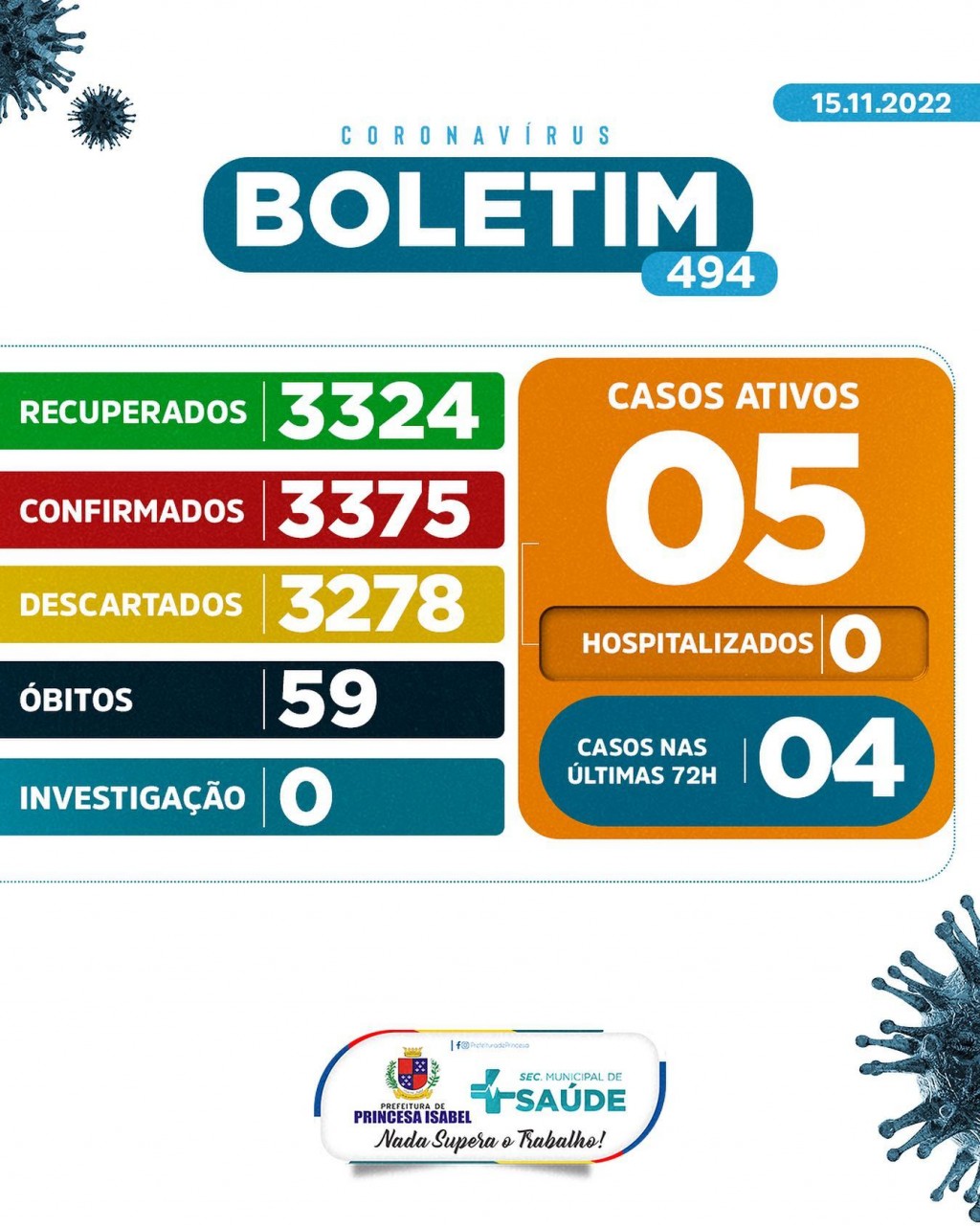 O Comitê Gestor da Crise COVID-19, em Princesa Isabel, informa: 1. Até o momento foram atendidos no Hospital Regional Deputado José Pereira Lima, UPA 24h e na Rede de Atenção Básica 6.653 pessoas suspeitas de infecção por COVID-19 (Coronavírus); desses, 3.278 foram descartados, 3.375 confirmados e nenhum caso está em investigação. Dos confirmados, nenhum está hospitalizado, 3.324 foram recuperados e 59 foram a óbito. 2. Todas as medidas utilizadas para atestar como casos suspeitos e casos descartados, seguem rigorosamente o que preconiza o Ministério da Saúde; 3. As determinações do Ministério da Saúde para achatar a curva epidemiológica da disseminação da COVID-19 e de suas variantes continuam massificadas; 4. As determinações contidas nos decretos municipais DEVEM ser cumpridas. Princesa Isabel, 15 de novembro de 2022.