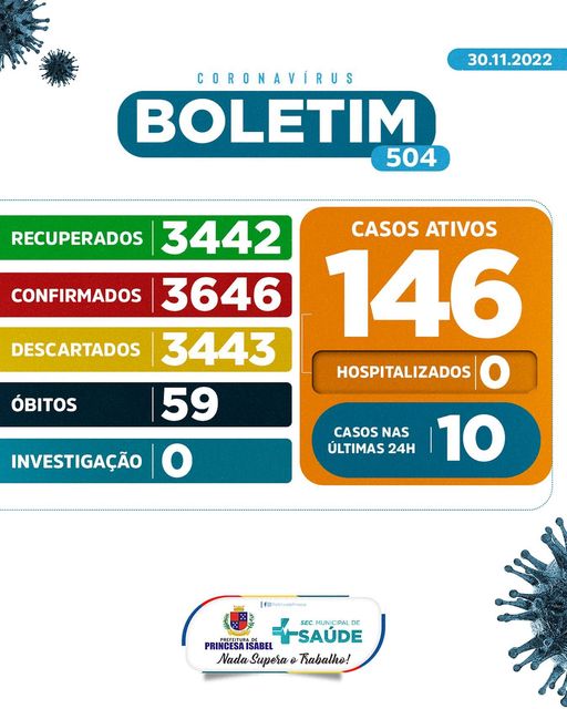O Comitê Gestor da Crise COVID-19, em Princesa Isabel, informa: 1. Até o momento foram atendidos no Hospital Regional Deputado José Pereira Lima, UPA 24h e na Rede de Atenção Básica 7.089 pessoas suspeitas de infecção por COVID-19 (Coronavírus); desses, 3.443 foram descartados, 3.646 confirmados e nenhum caso está em investigação. Dos confirmados, nenhum está hospitalizado, 3.442 foram recuperados e 59 foram a óbito. 2. Todas as medidas utilizadas para atestar como casos suspeitos e casos descartados, seguem rigorosamente o que preconiza o Ministério da Saúde; 3. As determinações do Ministério da Saúde para achatar a curva epidemiológica da disseminação da COVID-19 e de suas variantes continuam massificadas; 4. As determinações contidas nos decretos municipais DEVEM ser cumpridas. Princesa Isabel, 30 de novembro de 2022.