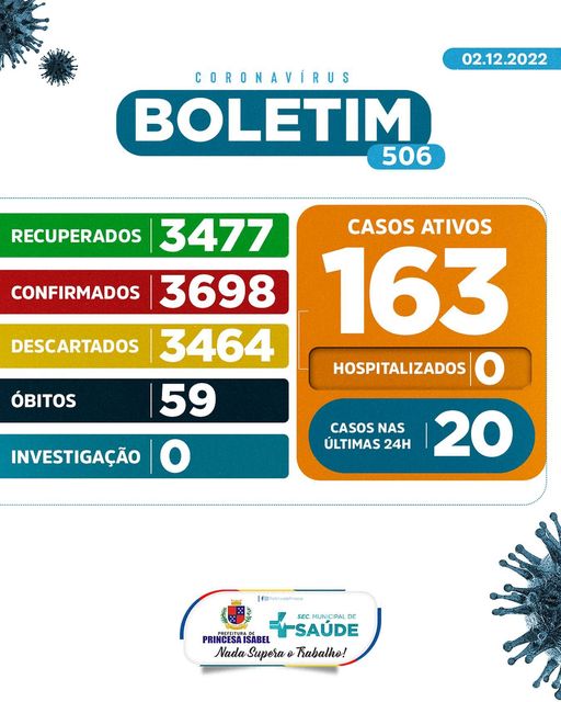 O Comitê Gestor da Crise COVID-19, em Princesa Isabel, informa: 1. Até o momento foram atendidos no Hospital Regional Deputado José Pereira Lima, UPA 24h e na Rede de Atenção Básica 7.162 pessoas suspeitas de infecção por COVID-19 (Coronavírus); desses, 3.464 foram descartados, 3.698 confirmados e nenhum caso está em investigação. Dos confirmados, nenhum está hospitalizado, 3.477 foram recuperados e 59 foram a óbito. 2. Todas as medidas utilizadas para atestar como casos suspeitos e casos descartados, seguem rigorosamente o que preconiza o Ministério da Saúde; 3. As determinações do Ministério da Saúde para achatar a curva epidemiológica da disseminação da COVID-19 e de suas variantes continuam massificadas; 4. As determinações contidas nos decretos municipais DEVEM ser cumpridas. Princesa Isabel, 02 de dezembro de 2022.