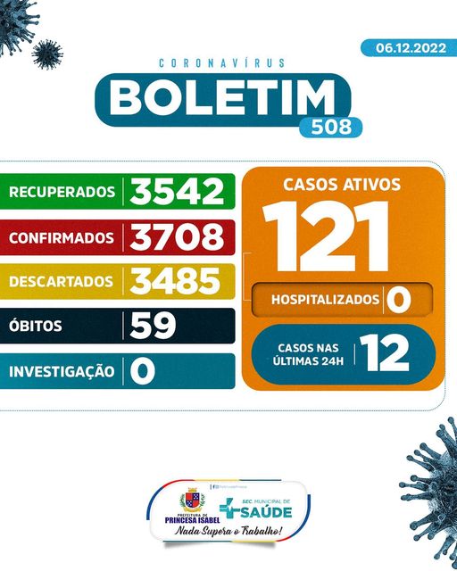 O Comitê Gestor da Crise COVID-19, em Princesa Isabel, informa: 1. Até o momento foram atendidos no Hospital Regional Deputado José Pereira Lima, UPA 24h e na Rede de Atenção Básica 7.193 pessoas suspeitas de infecção por COVID-19 (Coronavírus); desses, 3.485 foram descartados, 3.708 confirmados e nenhum caso está em investigação. Dos confirmados, nenhum está hospitalizado, 3.542 foram recuperados e 59 foram a óbito. 2. Todas as medidas utilizadas para atestar como casos suspeitos e casos descartados, seguem rigorosamente o que preconiza o Ministério da Saúde; 3. As determinações do Ministério da Saúde para achatar a curva epidemiológica da disseminação da COVID-19 e de suas variantes continuam massificadas; 4. As determinações contidas nos decretos municipais DEVEM ser cumpridas. Princesa Isabel, 06 de dezembro de 2022.