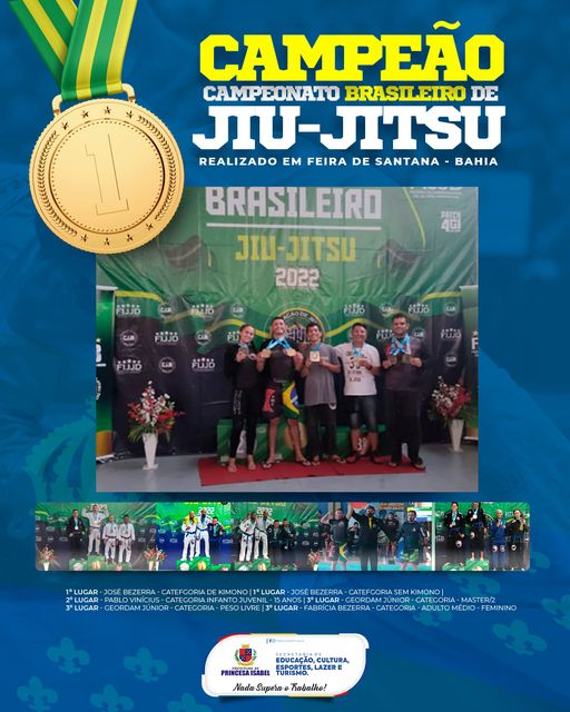 O governo municipal de Princesa Isabel parabeniza os atletas princesenses pelas vitórias alcançadas no Campeonato Brasileiro de Jiu-jitsu, realizado em Feira de Santana, na Bahia. Que vocês alcem vôos cada vez mais altos em direção à realização dos seus sonhos.