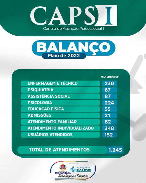 O Centro de Atenção Psicossocial tipo 1 (CAPS I) de Princesa realizou, somente no mês de maio, o total de 1.245 atendimentos. Desses, foram 230 em enfermagem e/ou técnico, 67 em psiquiatria, 87 em assistência social, 224 em Psicologia e 55 de Educação Física. Os atendimentos foram realizados com 152 usuários, dos quais 21 iniciaram o acompanhamento no serviço durante esse mês. Além disso, foram realizados 348 atendimentos individualizados e 82 familiar.