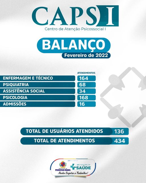 O Centro de Atenção Psicossocial I de Princesa realizou um total de 434 atendimentos durante o mês de fevereiro. Desses, foram 164 atendimentos de enfermagem/tecnico, 68 de Psiquiatria, 34 de Assistência Social e 168 de Psicologia. Foram atendidos 136 usuários, dos quais 16 iniciaram os atendimentos no serviço dentro do mês.