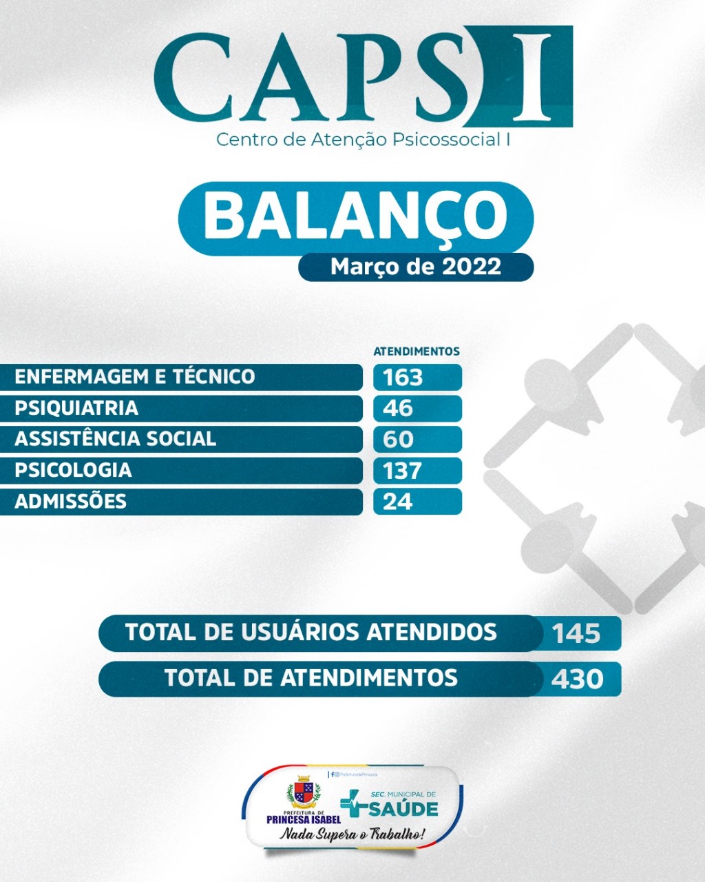 O Centro de Atenção Psicossocial tipo 1 (CAPS I) de Princesa realizou, somente no mês de março, o total de 430 atendimentos. Desses, foram 163 em enfermagem e/ou técnico, 46 em psiquiatria, 60 em assistência social e 137 em Psicologia. Os atendimentos foram realizados com 145 usuários, dos quais 24 iniciaram o acompanhamento no serviço durante esse mês.