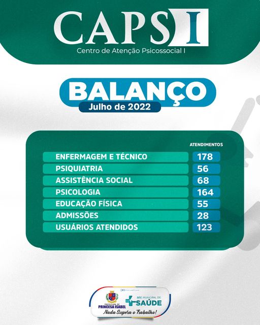 O Centro de Atenção Psicossocial tipo 1 (CAPS I) de Princesa realizou, somente no mês de julho, o total de 521 atendimentos. Desses, foram 178 em enfermagem e/ou técnico, 56 em psiquiatria, 68 em assistência social, 164 em Psicologia e 55 de Educação Física. Os atendimentos foram realizados com 123 usuários, dos quais 28 iniciaram o acompanhamento no serviço durante o mês.