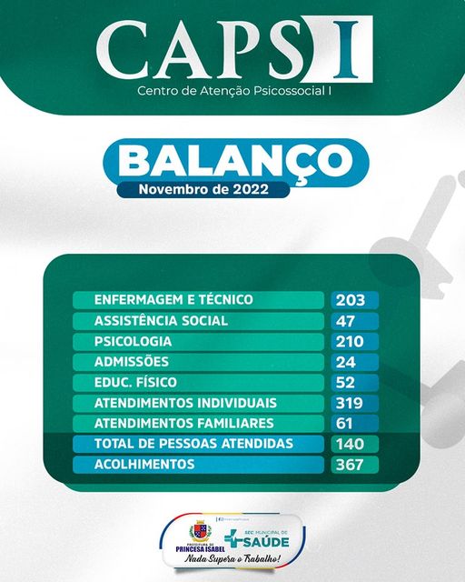 O Centro de Atenção Psicossocial tipo 1 (CAPS I) de Princesa realizou, somente no mês de setembro, o total de 522 atendimentos. Desses, foram 203 em enfermagem e/ou técnico, 47 em assistência social e 210 em Psicologia. Os atendimentos foram realizados com 140 usuários, dos quais 24 iniciaram o acompanhamento no serviço durante esse mês.