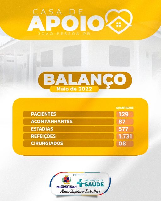 Somente no mês de maio de 2022 foram realizados 216 acolhimentos, desses, 08 pacientes que passaram por algum procedimento cirúrgico; 577 estadias e 1.731 refeições, incluindo café, almoço e jantar, entre pacientes, acompanhantes e motoristas.