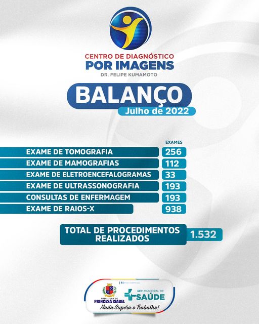 O Centro de Diagnóstico por Imagem Dr. Felipe Kumamoto realizou, durante o mês de julho de 2022, 1.532 procedimentos. Desses, foram 256 tomografias, 112 mamografias, 33 eletroencefalogramas, 193 ultrassonografias, 938 exames de raio-X e 193 consultas de enfermagem.