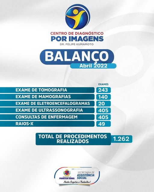 O Centro de Diagnóstico por Imagem Dr. Felipe Kumamoto realizou, durante o mês de abril de 2022, 1.262 procedimentos. Desses, foram 243 tomografias, 140 mamografias, 20 eletroencefalogramas, 405 ultrassonografias, 49 exames de Raio-X e 405 consultas de enfermagem.