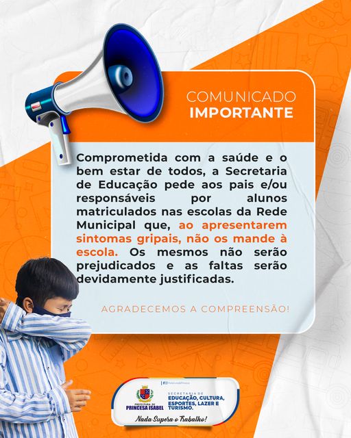 A nossa missão é cuidar e preservar a saúde de todos. Então, diante dessa preocupação, pedimos que seu seu filho apresentar algum sintoma gripal durante a semana, não o mande à escola. É importante também ficar sempre atento ao grupo da turma no whatsapp, pois os professores estarão repassando as informações sobre as atividades do dia por lá, para que ninguém atrase o conteúdo e se prejudique.