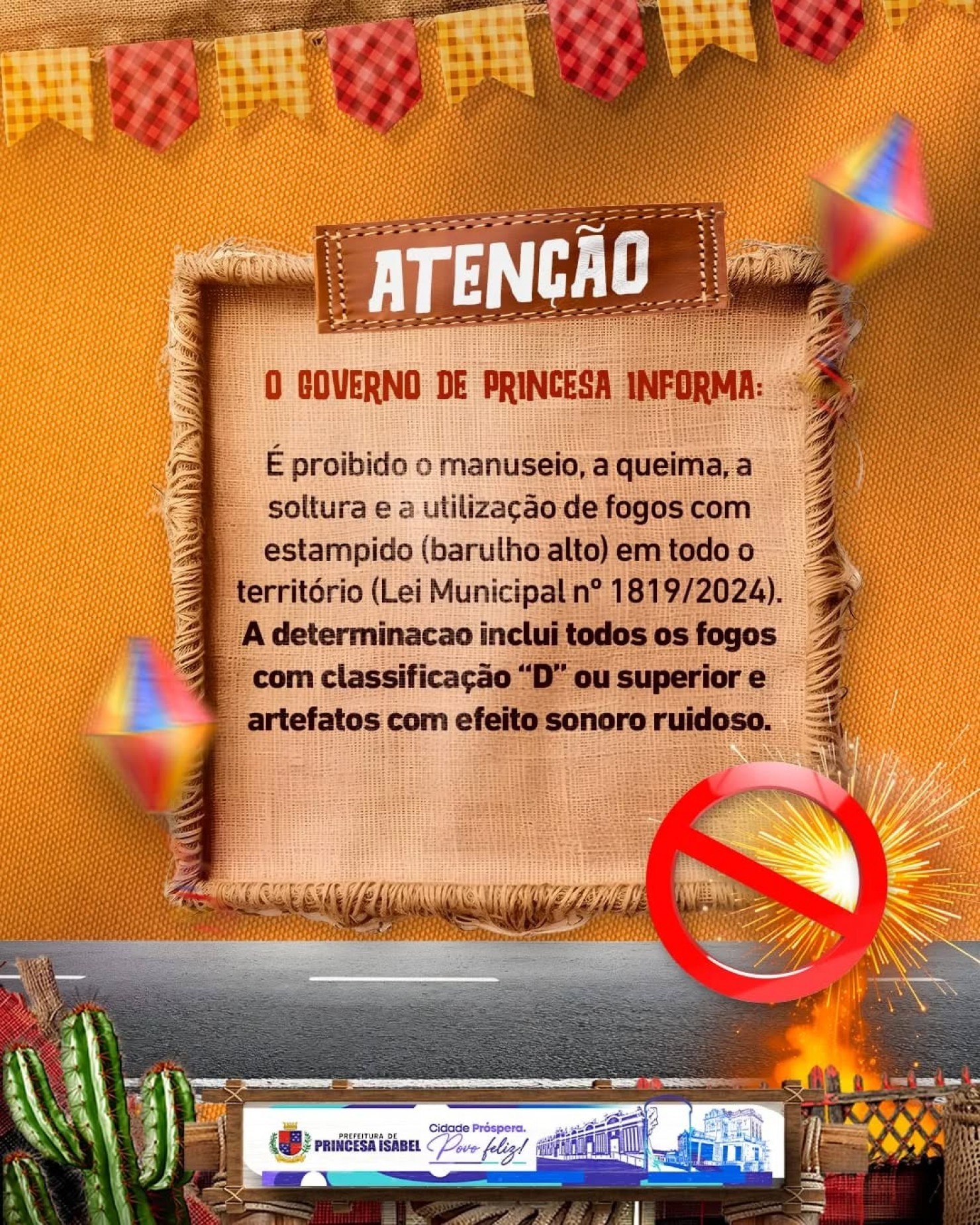O Governo de Princesa Isabel informa que está proibido o uso de fogos com estampido (barulho alto) em todo o território municipal, conforme a Lei Municipal nº 1819/2024.