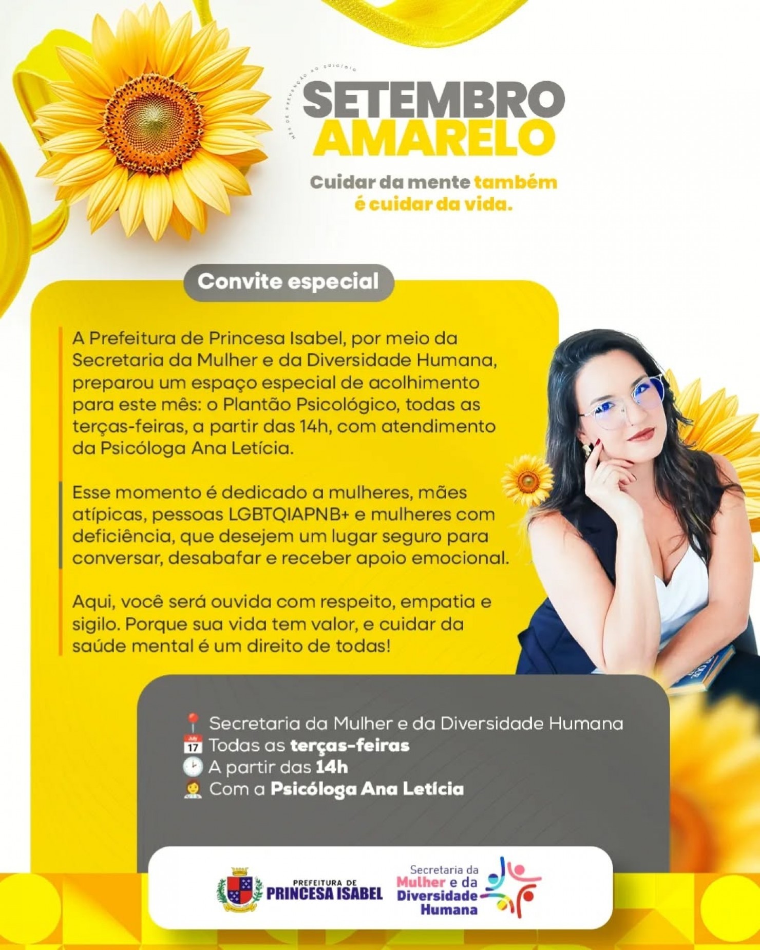 A Prefeitura de Princesa Isabel, por meio da Secretaria da Mulher e da Diversidade Humana, preparou um espaço especial de acolhimento neste mês: o Plantão Psicológico, com a psicóloga Ana Letícia.
