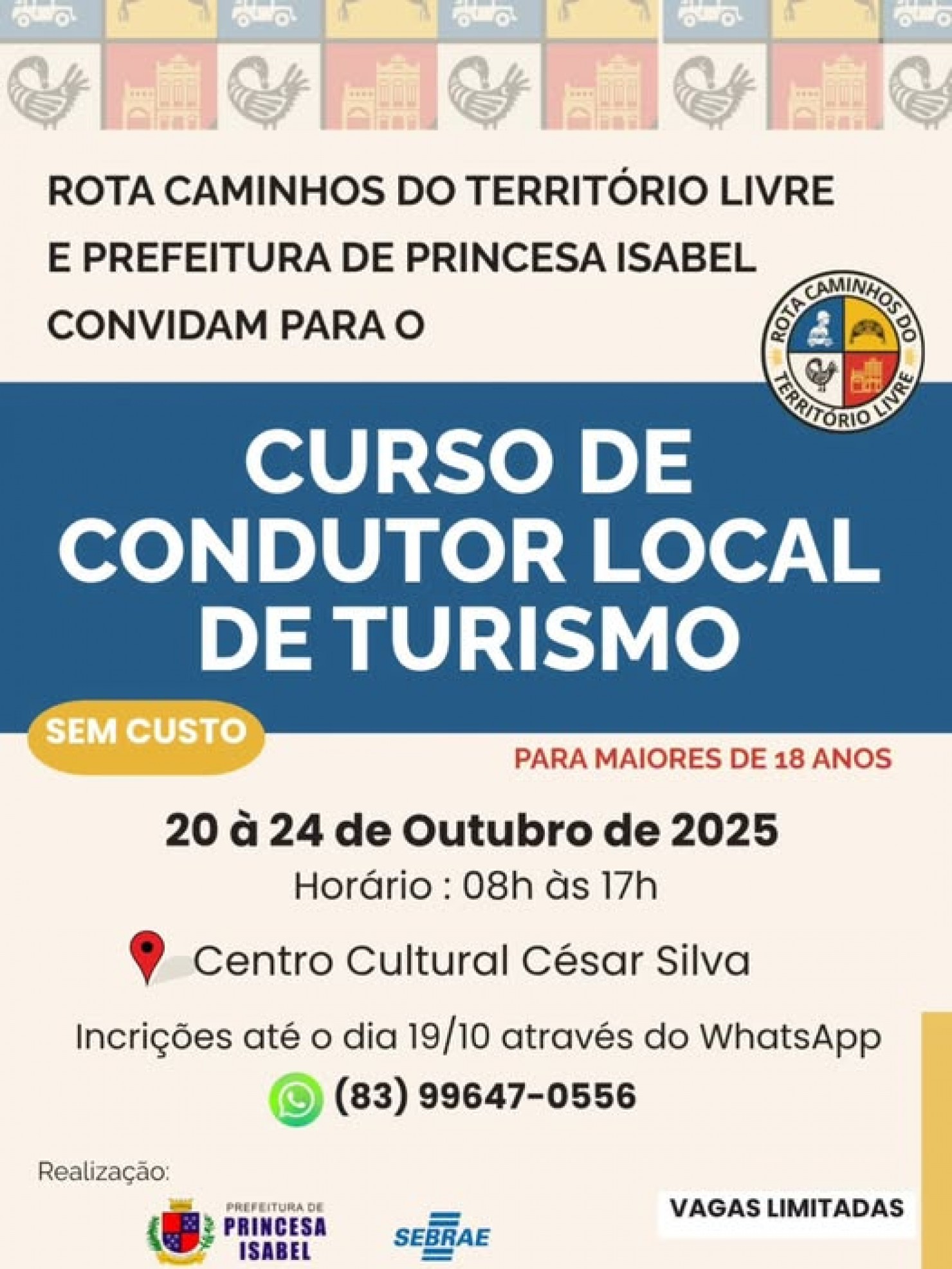 Prefeitura de Princesa Isabel, em parceria com o SEBRAE, está oferecendo o Curso de Condutor de Turismo!