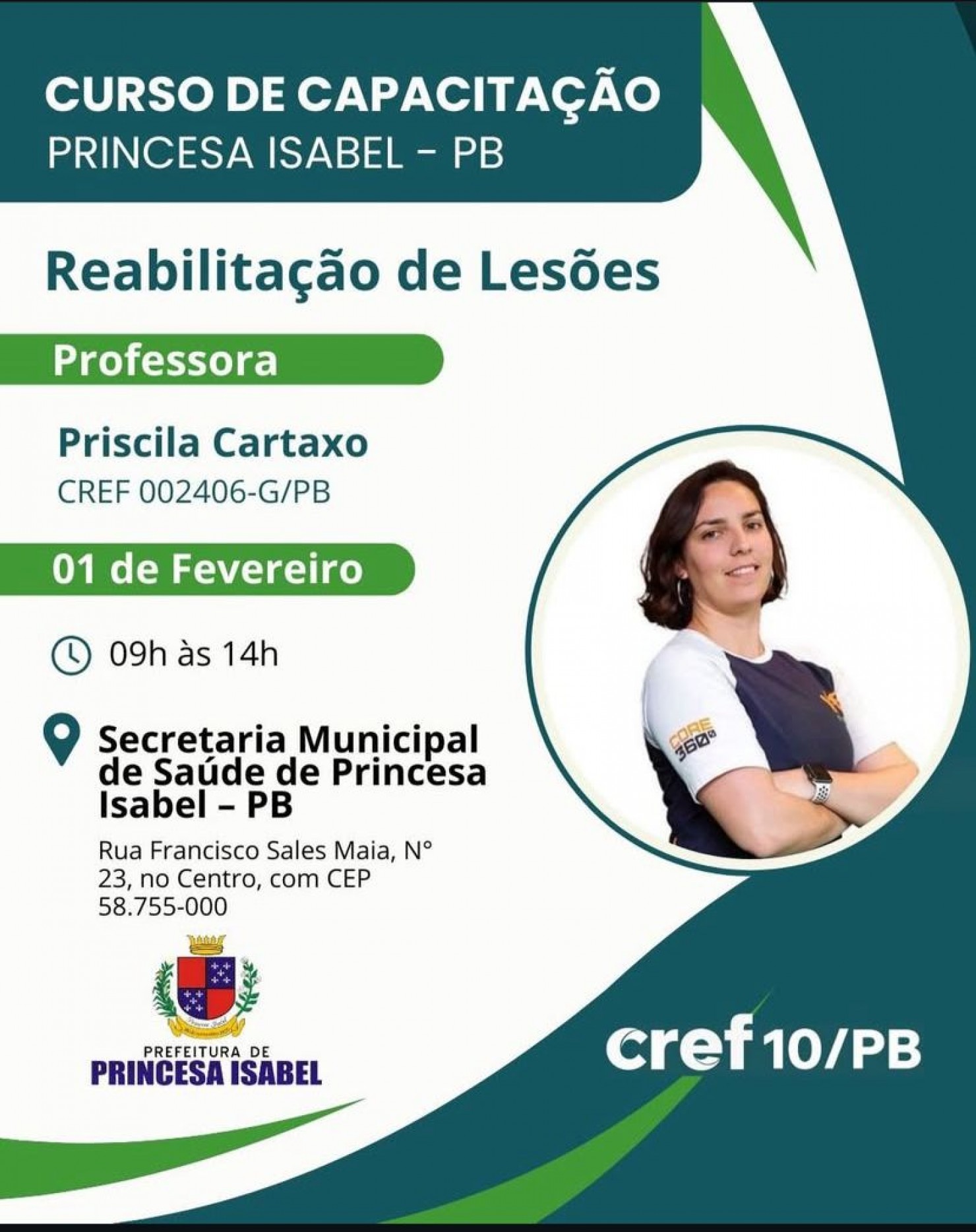 A Prefeitura de Princesa Isabel, por meio da Secretaria Municipal de Saúde, realizará o Curso de Capacitação em Reabilitação de Lesões, ministrado pela professora Priscila Cartaxo (profissional credenciada pelo CREF 10/PB), fortalecendo a qualificação dos profissionais e o cuidado com a saúde da população.