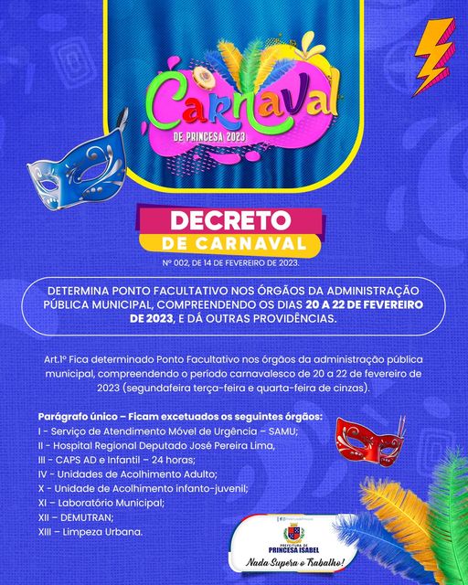 Decretro 002 - 2023, Ponto facultativo de Carnaval. Link:Clique aqui