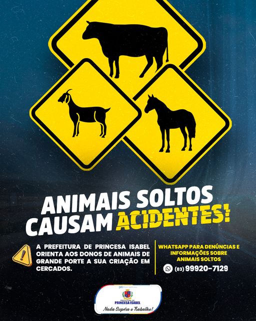 A Prefeitura de Princesa Isabel intensificou a campanha contra animais soltos em perímetros urbanos e estradas. Animais de grande porte causam acidentes que podem ser fatais. Os donos podem ser responsabilizados com multas e criminalmente.