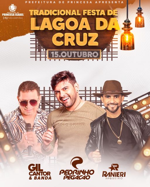 Dia 15 de outubro, em Lagoa da Cruz - PB/PE, a tradicional festa volta com Pedrinho Pegação, Raniery, Gil Cantor e Banda! Realização: Prefeitura de Princesa Isabel.