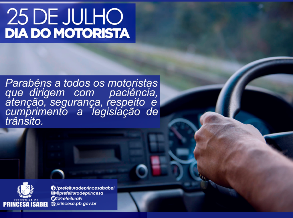 Hoje, 25 de julho, é também comemorado o Dia do Motorista. Os nossos cumprimentos a todos aqueles que exercem seu ofício com responsabilidade, consciência, disciplina e respeito. Vocês são imprescindíveis em qualquer área da nossa sociedade, carregando progresso e transportando sonhos.