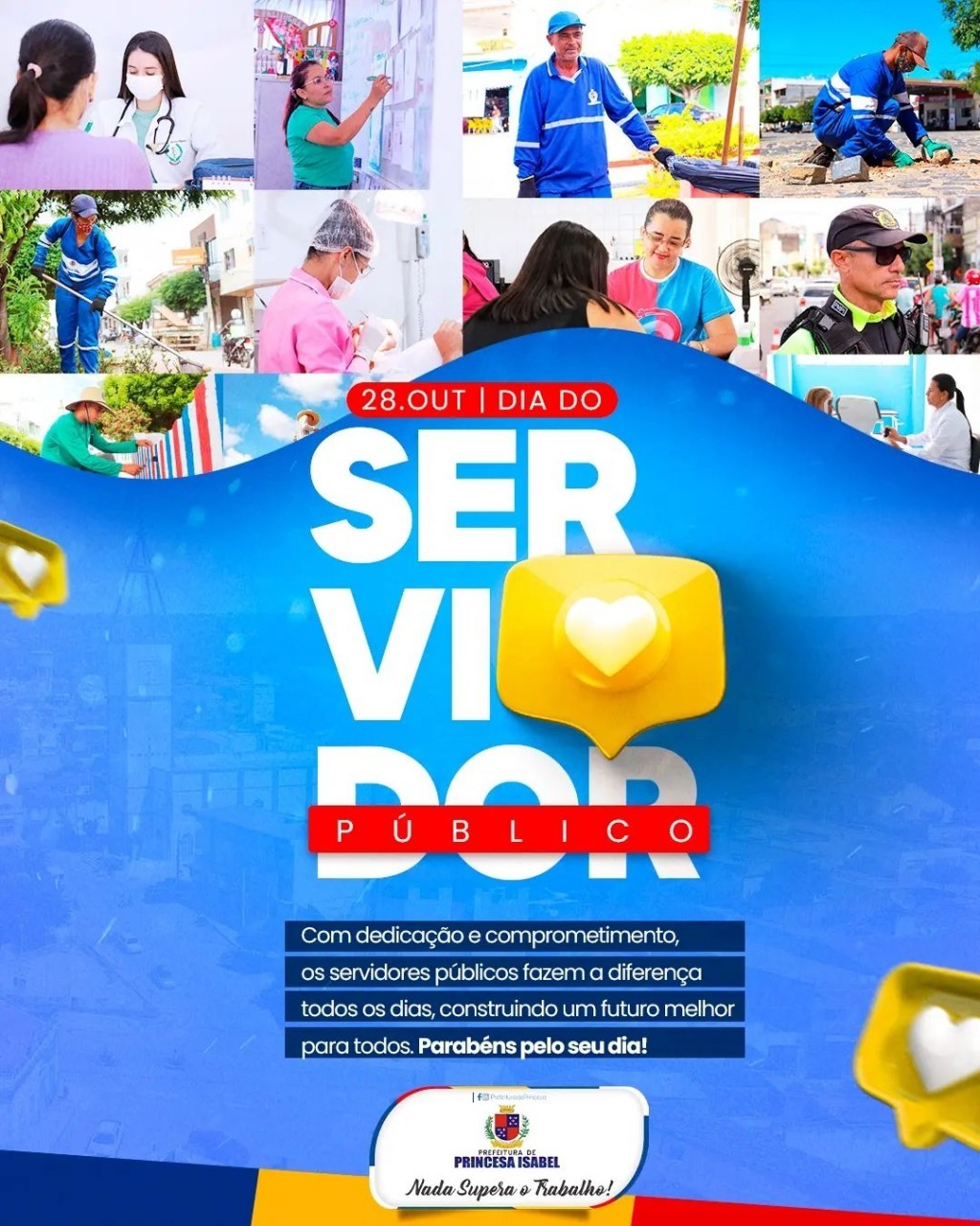 O Governo de Princesa Isabel cumprimenta todos os servidores públicos municipais pela passagem do seu dia. Agradecemos por tamanha dedicação e comprometimento em cuidar da nossa cidade, em todos os setores, trabalhando sempre pelo progresso e desenvolvimento do nosso município, de forma integral.