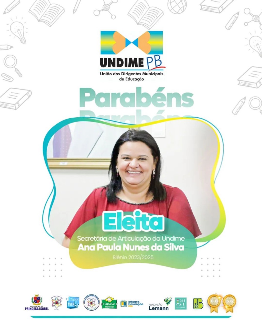 Nossa secretária municipal de Educação, Cultura, Esportes, Lazer e Turismo agora compõe a UNDIME-PB, como Secretária de Articulação da Diretoria Executiva da instituição. Ana Paula Nunes da Silva foi eleita para o biênio 2023/2025.