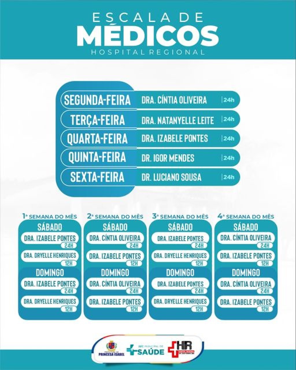 Confira a escala médica do Hospital Regional Deputado José Pereira Lima, que atende 24h por dia, 7 dias por semana, pacientes de Princesa e de outros 17 municípios do sertão e alto sertão da Paraíba e do Pernambuco!