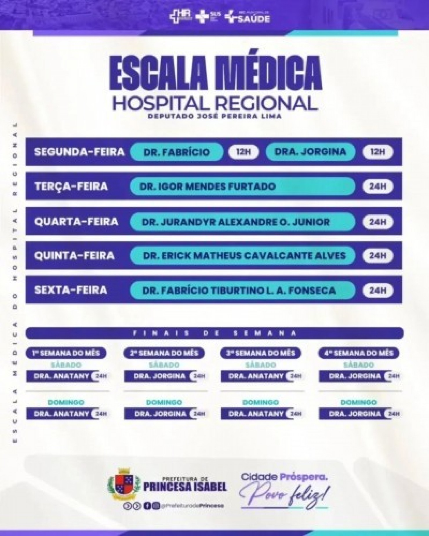 Confira a escala médica do Hospital Regional Deputado José Pereira Lima. Assistência médica 24h por dia, com profissionais comprometidos com a saúde da população de Princesa e da região.