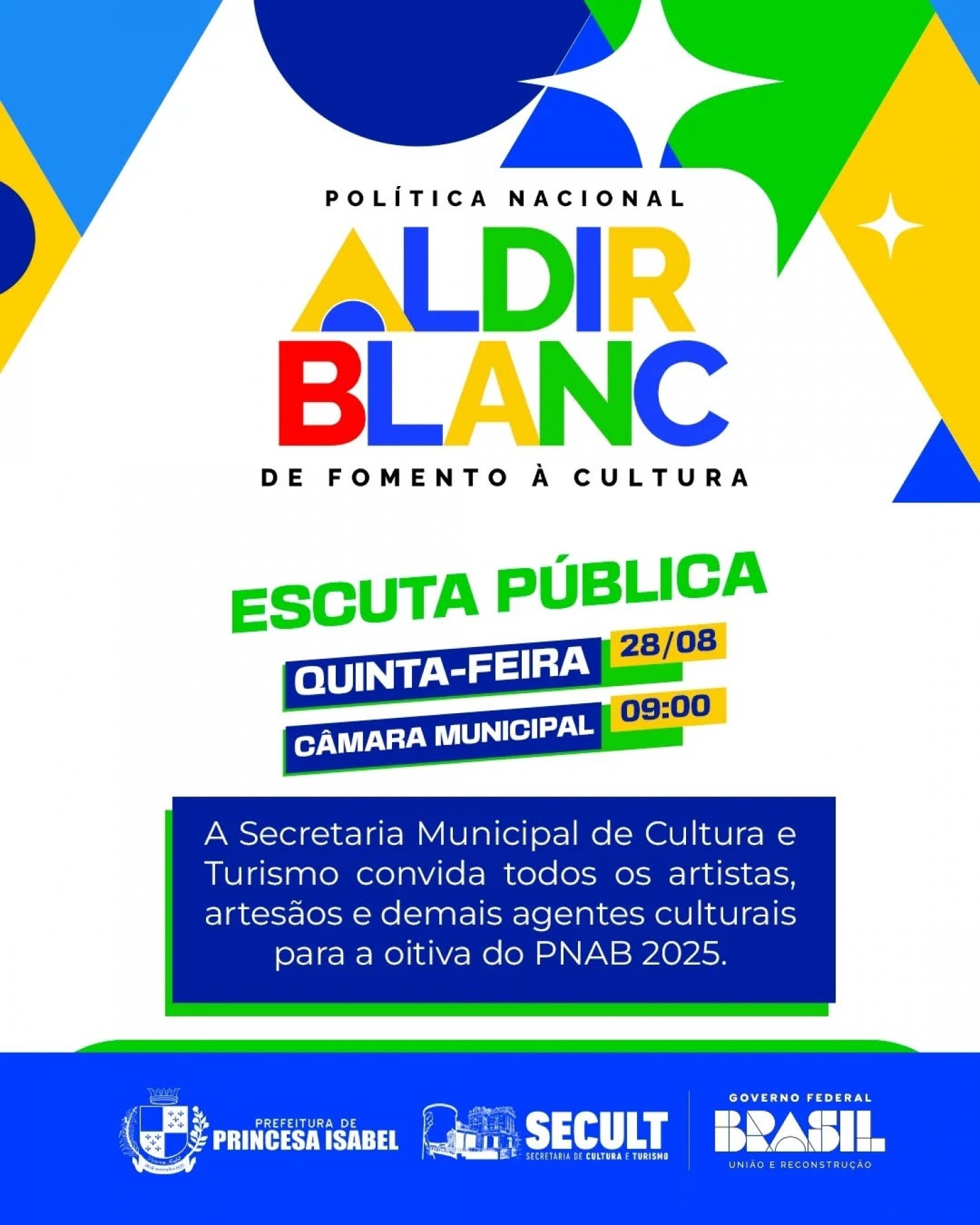 A Secretaria Municipal de Cultura e Turismo convida todos os artistas, artesãos e agentes culturais para a Escuta Pública da Política Nacional Aldir Blanc (PNAB) 2025.