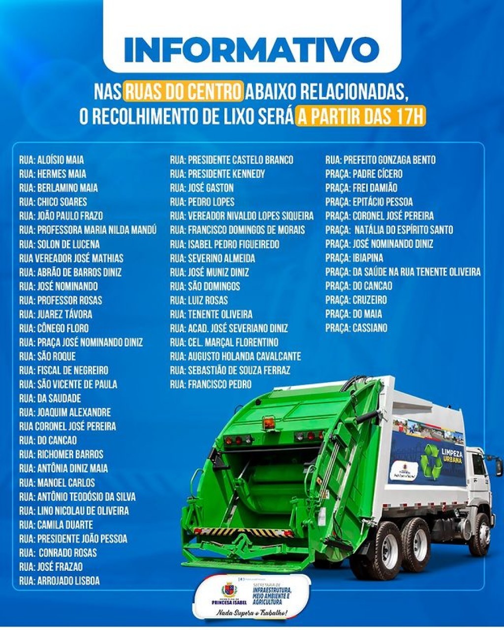 Atenção para o novo horário de coleta de lixo nas ruas do Centro da cidade!