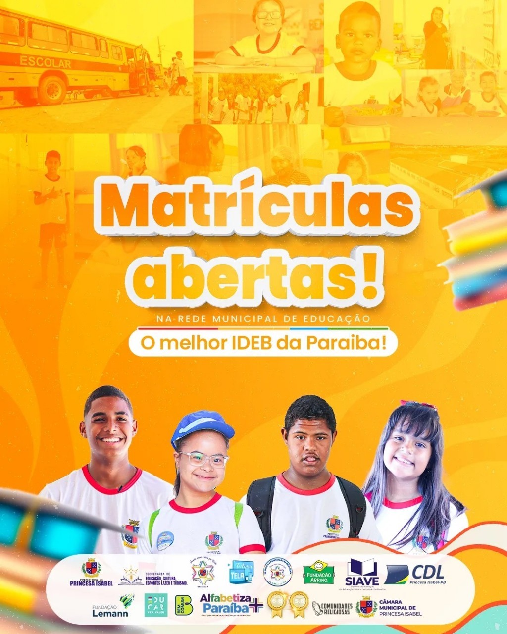 As matrículas na rede municipal de educação estão abertas! Princesa Isabel tem o melhor IDEB da Paraíba nos anos iniciais do ensino fundamental e ocupa o quarto lugar entre os anos finais. O município tem um dos melhores índices de fluência em leitura do Brasil com 95%.