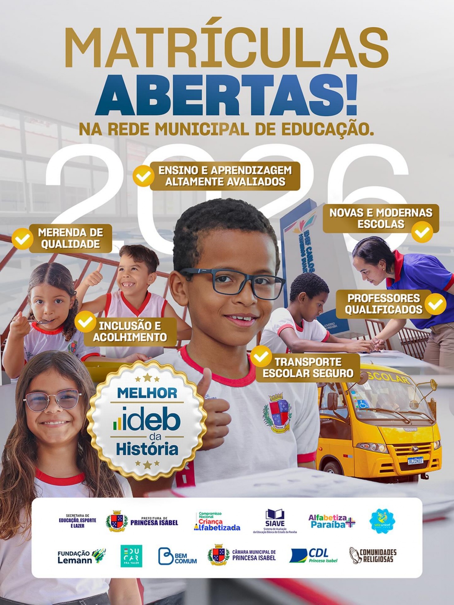Garanta uma educação de qualidade para seu filho em uma rede que oferece transporte escolar seguro, novas e modernas escolas, inclusão e acolhimento, professores qualificados, merenda de qualidade, ensino e aprendizagem altamente avaliados.