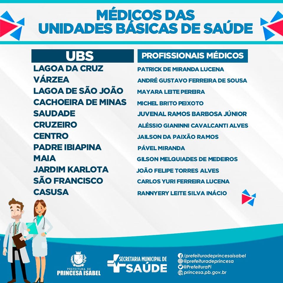 Estamos com 100% de cobertura médica nas nossas Unidades Básicas de Saúde. São 12 UBS’s, distribuídas pelos bairros da cidade, além de 10 Postos âncoras de Saúde na zona rural. Confira os profissionais médicos que atuam em cada Unidade!