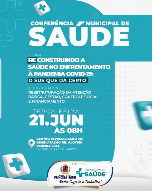 Nesta terça-feira (21), Princesa Isabel realiza a conferência Municipal de Saúde, com o tema: "Reconstruindo a saúde no enfrentamento à pandemia COVID-19: O SUS que dá certo". A mesma será realizada a partir das 8h, no Centro Especializado em Reabilitação Dr. Aloysio Pereira Lima, saída para a Várzea.
