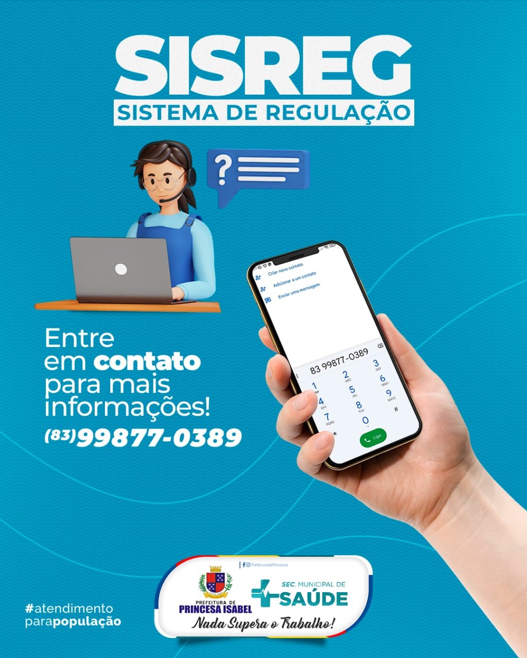 O nosso sistema de regulação está disponibilizando um número de telefone para repassar informações sobre o serviço à população. Confira!