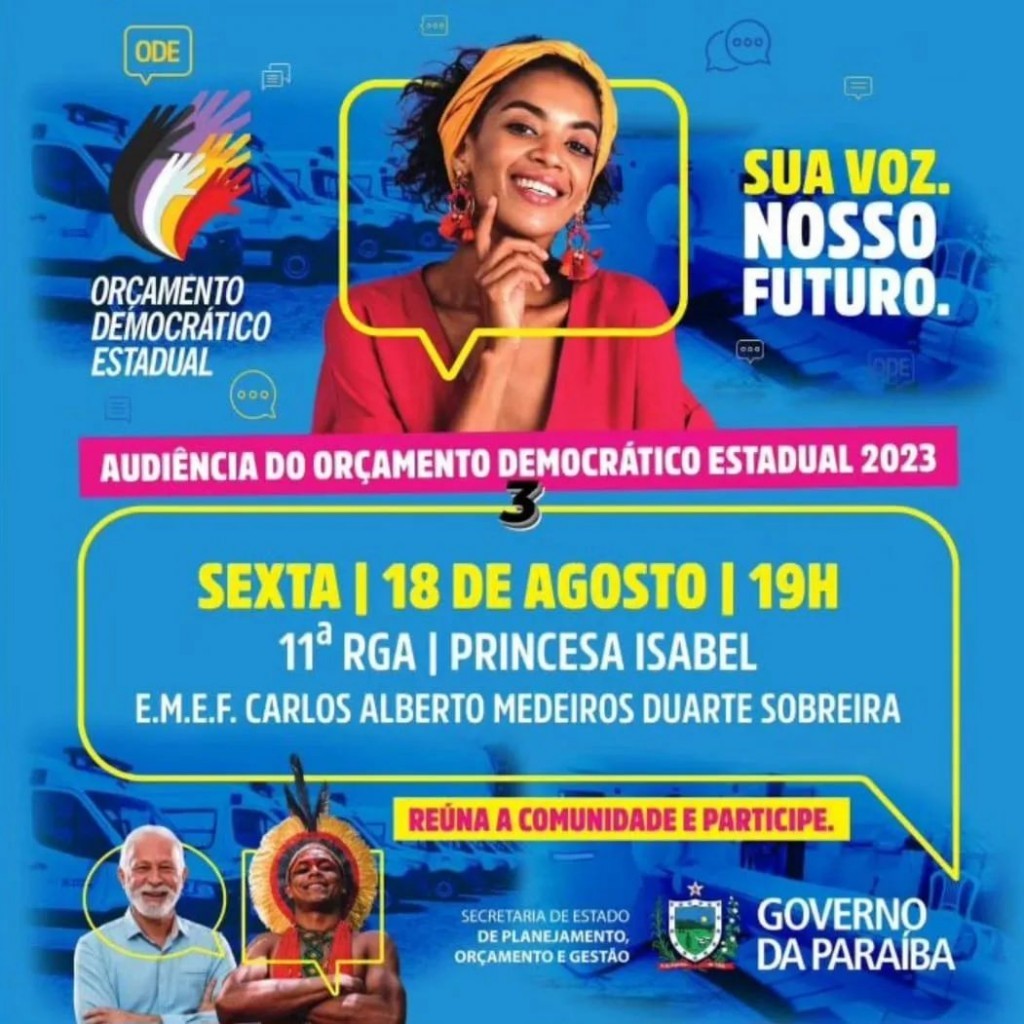 A plenária do Orçamento Democrático Estadual acontece em Princesa Isabel na próxima sexta-feira (18), às 19h, na quadra poliesportiva da Escola Carlos Alberto Medeiros Duarte Sobreira. O ODE acontece com a presença do governador da Paraíba, secretários de Estado, prefeitos da região administrativa e, principalmente, toda a sociedade onde cidadãos/ãs são convidados/as a participar das decisões do governo estadual sobre a melhor forma de aplicação do dinheiro público em suas obras e serviços.