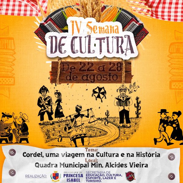 O Grupo de Cultura Abolição, em parceria com a Diretoria Municipal de Cultura, Turismo e Eventos, realizará, de 22 a 28 de agosto, a IV Semana da Cultura. Esta edição, que será realizada na Quadra Poliesportiva Ministro Alcides Vieira Carneiro, terá como tema: “Cordel, uma viagem na cultura e na história” e contará com atividades, oficinas, palestras, rodas de conversa, exposições dos produtos produzidos por artesãos locais, apresentação de artistas, escritores, cordelistas, poetas, bandas marciais e filarmônicas, danças folclóricas, show pirotécnico e grupos musicais.