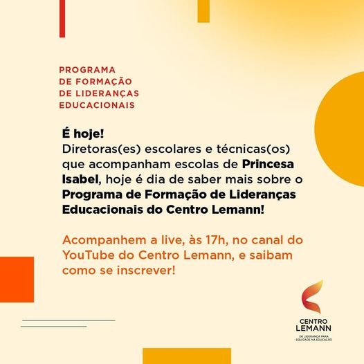 O município de Princesa Isabel – PB, destaque em educação de qualidade no Brasil segundo a avaliação externa do Programa Educar pra Valer, da Fundação Lemann, participa do Programa de Lideranças Educacionais oferecido pelo Centro Lemann, aos diretores (as) e técnicos (as) escolares, com o objetivo de aprimorar mais ainda a qualidade da Educação nos municípios parceiros da Fundação.