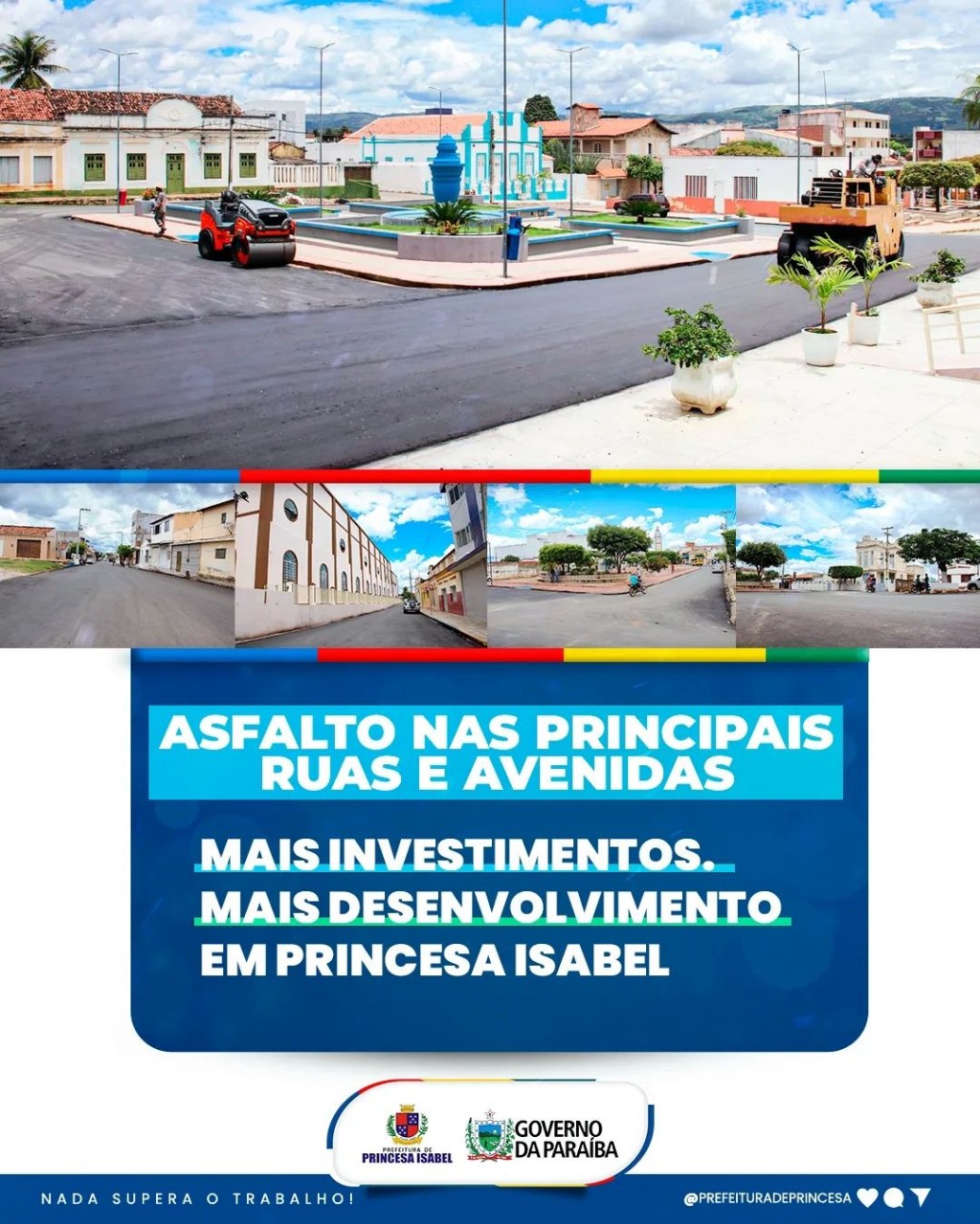 Já iniciamos o asfalto nas principais ruas e avenidas de nossa cidade e, somado às quase 100 ruas pavimentadas em paralelepípedos e à obra de esgotamento sanitário, temos o maior investimento em infraestrutura da história do município.